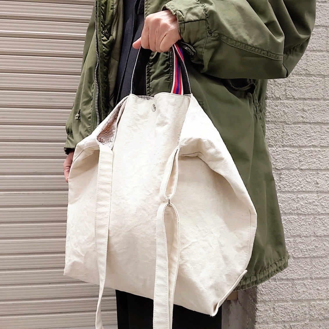 生成り帆布生地を使った2WAYバッグです。トートとしてもショルダーとしても、シーンに合わせてお使いいただけます。ワンウォッシュした生地、内側のタッターソール柄がオススメポイントです。中には大きめのポケットがあるので、スマホや小物の整理に重宝します。各部分のサイズは6~7枚目の写真にあります。●写真と実物の色味が異なって見える場合があります。予めご了承ください。
